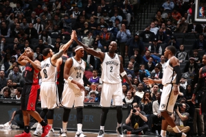 BROOKLYN, NY – JANUARY 27: Kevin Garnett #30 of the Brooklyn Nets and Deron Williams #8 of the Brooklyn Nets react against the Toronto Raptors during a game at Barclays Center in Brooklyn. NOTE TO USER: User expressly acknowledges and agrees that, by downloading and or using this photograph, User is consenting to the terms and conditions of the Getty Images License Agreement. Mandatory Copyright Notice: Copyright 2014 NBAE (Photo by Nathaniel S. Butler/NBAE via Getty Images)