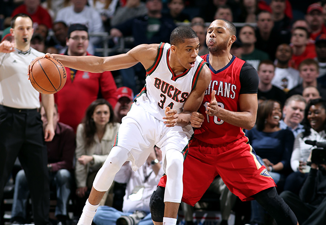 MILWAUKEE, WI – MARCH 9: Giannis Antetokounmpo #34 of the Milwaukee Bucks handles the ball against Eric Gordon #10 of the New Orleans Pelicans on March 9, 2015 at the BMO Harris Bradley Center in Milwaukee, Wisconsin. NOTE TO USER: User expressly acknowledges and agrees that, by downloading and or using this Photograph, user is consenting to the terms and conditions of the Getty Images License Agreement. Mandatory Copyright Notice: Copyright 2015 NBAE (Photo by Gary Dineen/NBAE via Getty Images)